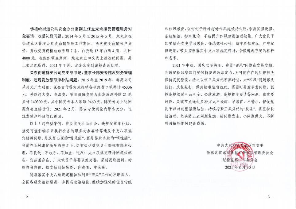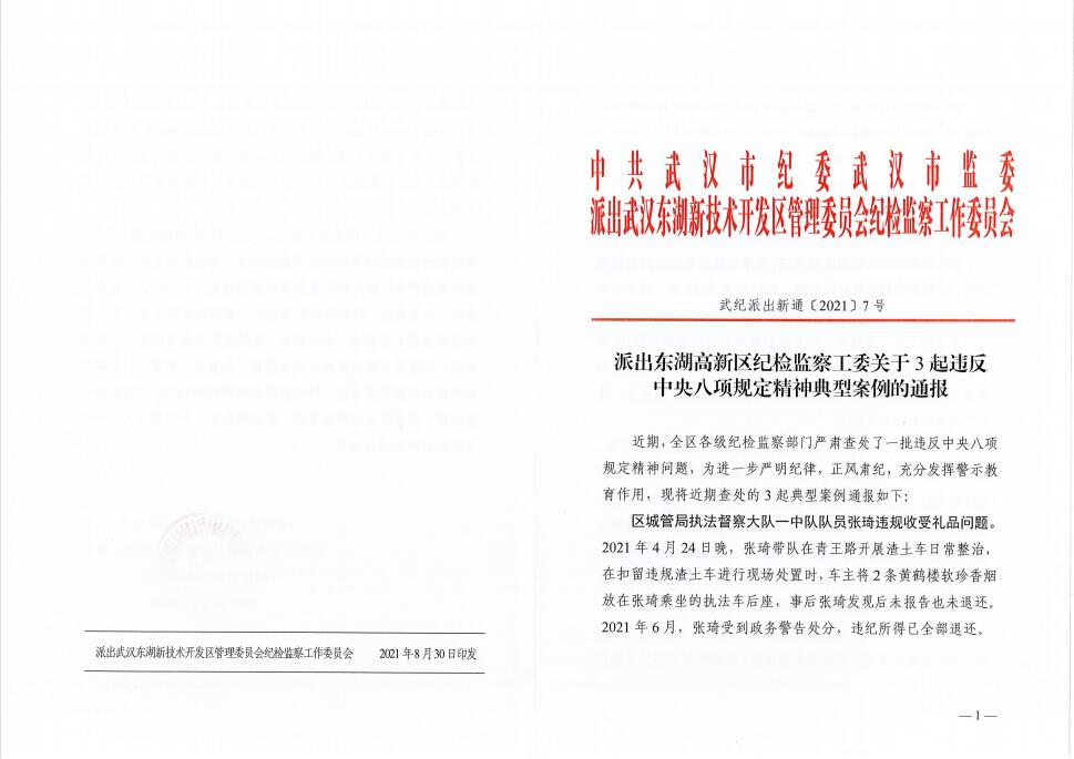 派出東湖高新區(qū)紀(jì)檢監(jiān)察工委關(guān)于3起違反中央八項(xiàng)規(guī)定精神典型案例的通報(bào)