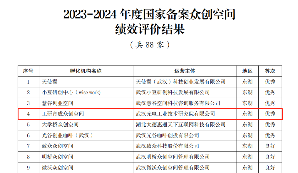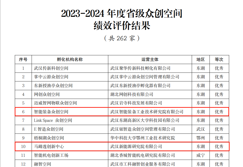 在國家備案眾創(chuàng)空間績效評價中,光谷產(chǎn)投運營的“工研育成眾創(chuàng)空間”獲評“優(yōu)秀”;在省級眾創(chuàng)空間績效評價中,智裝院運營的“智能裝備眾創(chuàng)空間”、新能源研究院運營的“馬蹄蓮創(chuàng)新中心”獲評“優(yōu)秀”。